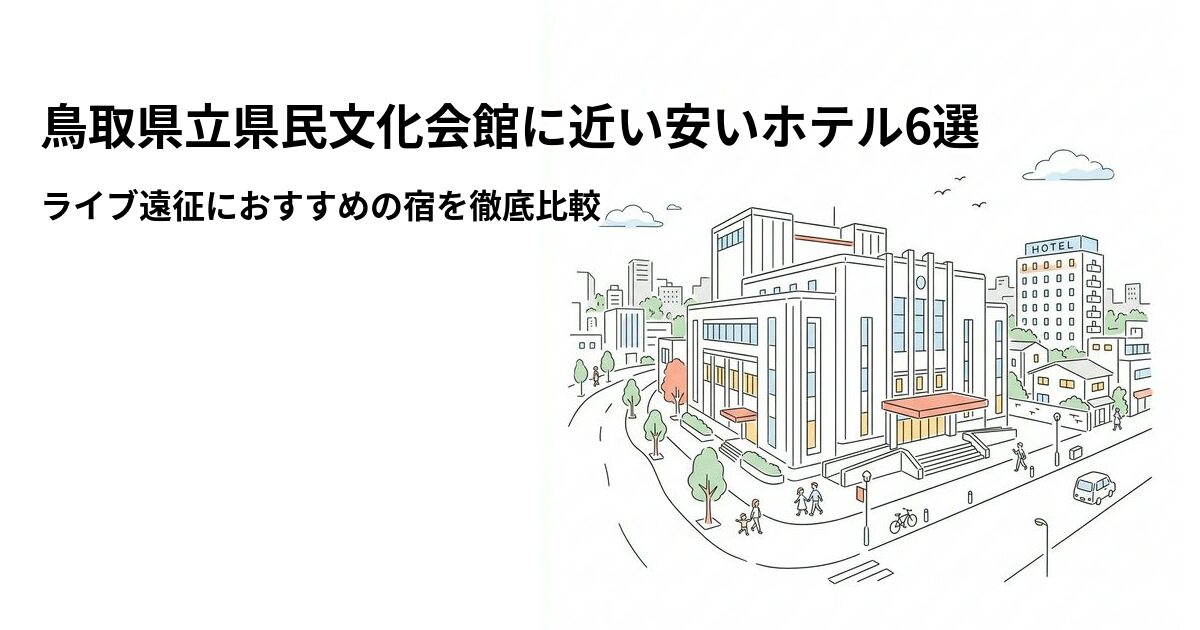 無料駐車場328台分が併設されていますが、大型公演時は満車になることも。終演後はバスの本数が減るため、会場近くのホテルに泊まって翌朝ゆっくり帰るのが遠征の賢い選択です。この記事では、楽天トラベルの料金・口コミデータをもとに「鳥取県立県民文化会館に近い安いホテル6選」を徹底比較しました。