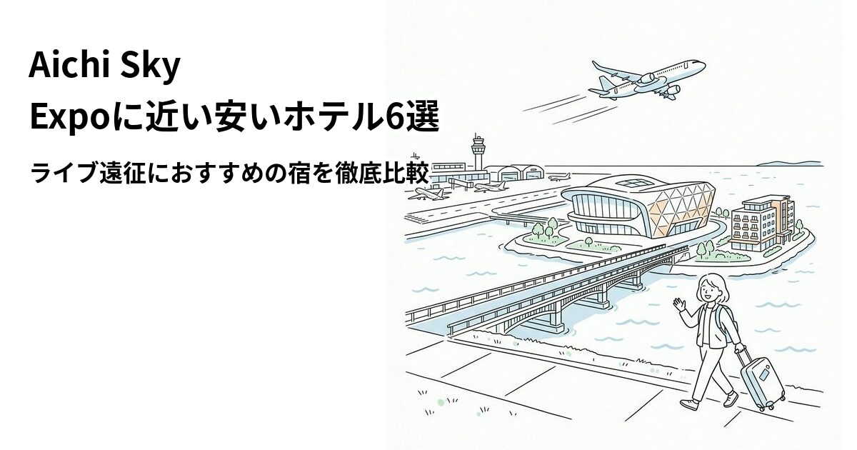 Aichi Sky Expo(愛知県国際展示場)でのライブやコンサートが決まったら、次に気になるのが宿泊先ですよね。Aichi Sky Expoは愛知県常滑市の中部国際空港(セントレア)の人工島内にある展示場で、最大約10,000人規模のコンサートが開催されています。最寄り駅は名鉄「中部国際空港駅」で、名古屋駅からμSKY(ミュースカイ)で最速28分。
