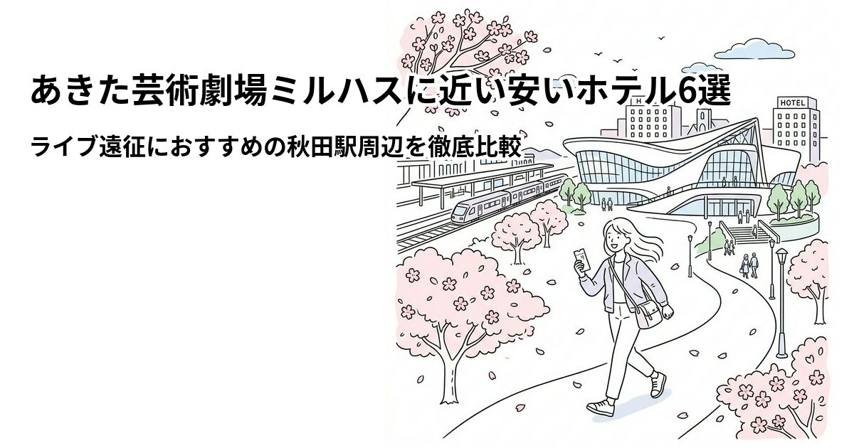 あきた芸術劇場ミルハス周辺で「近い・安い」を両立するホテルを6つ紹介しました。総合的に最もおすすめなのはダイワロイネットホテル秋田駅前。ミルハスまで徒歩約2分・評価★4.51・大浴場完備・¥3,600〜と、ライブ遠征に必要な要素がすべて揃っています。