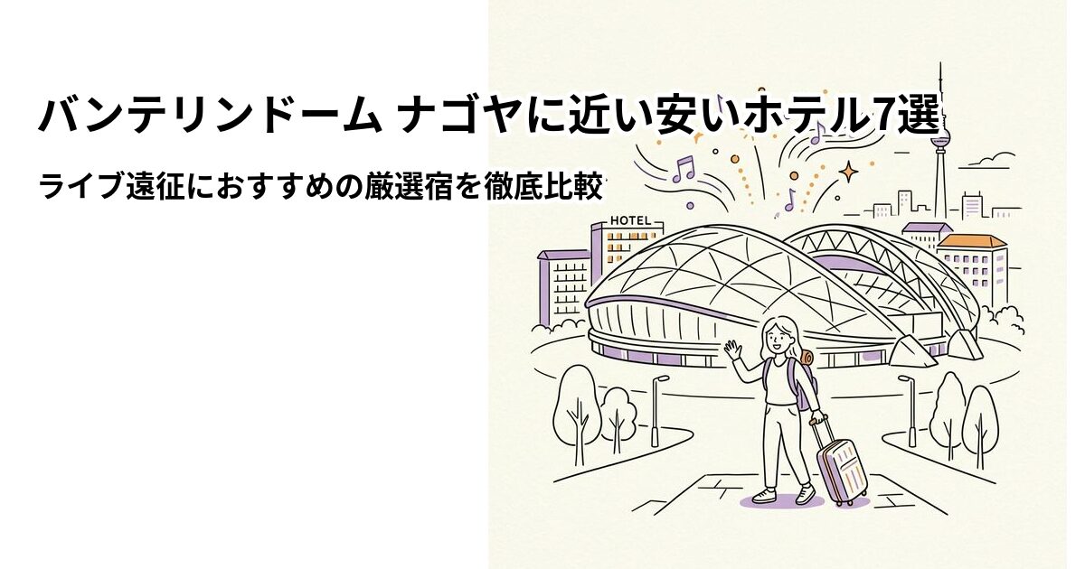 バンテリンドーム ナゴヤでのライブやコンサートが決まったら、次に考えるのがホテル選びですよね。バンテリンドーム ナゴヤの最寄り駅は地下鉄名城線「ナゴヤドーム前矢田」駅(徒歩約5分)と、JR・名鉄・地下鉄が乗り入れる「大曽根」駅(徒歩約15分)の2つ。ドーム周辺はビジネスホテルが少ないエリアですが、地下鉄東山線の今池・千種・栄エリアなら手頃なホテルが豊富で、ドームへのアクセスも良好です。