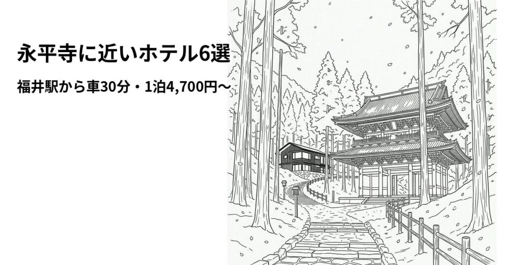 【2026年3月版】永平寺に近いホテル6選|福井駅から車30分・1泊4,700円〜 「永平寺を参拝したいけど、近くに泊まれるホテルはあるの?」と悩んでいませんか?曹洞宗の大本山・永平寺は山あいに佇む荘厳な禅寺で、周囲には宿泊施設がほとんどありません。最... -