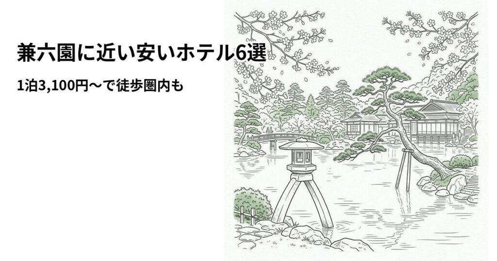 【2026年3月版】兼六園に近い安いホテル6選|1泊3,100円〜で徒歩圏内も 「兼六園に行きたいけど、近くのホテルは高そう…」と悩んでいませんか?金沢の中心部は宿泊費が高いイメージがありますが、実は兼六園の徒歩圏内でも1泊3,100円〜で泊まれるホテルが... -