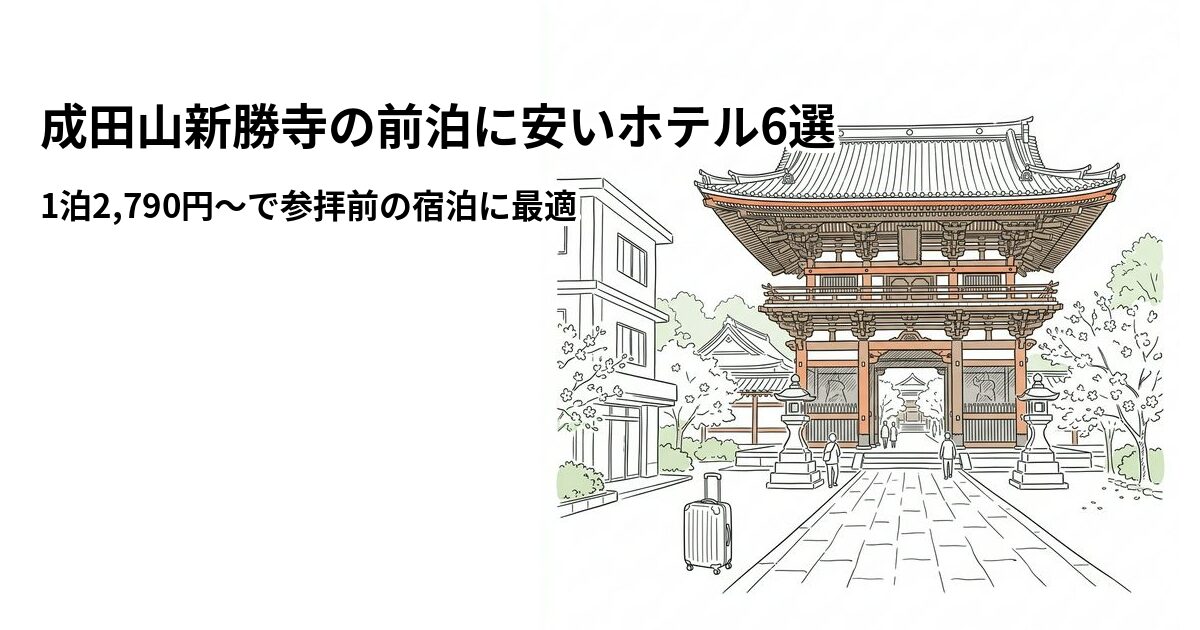 「成田山新勝寺に朝一番で参拝したいけど、前泊するにはどのホテルがいい?」とお悩みではありませんか?成田山新勝寺は年間約1,000万人が訪れる関東屈指のパワースポット。初詣や節分会のシーズンはもちろん、御護摩祈祷を朝の静かな時間に受けたい方には前泊がベストです。JR成田駅・京成成田駅から成田山まで徒歩約15分。駅周辺には1泊2,790円〜泊まれるリーズナブルなホテルが揃っています。この記事では、楽天トラベルの料金・口コミデータをもとに「成田山の前泊におすすめの安いホテル6選」を徹底比較しました。