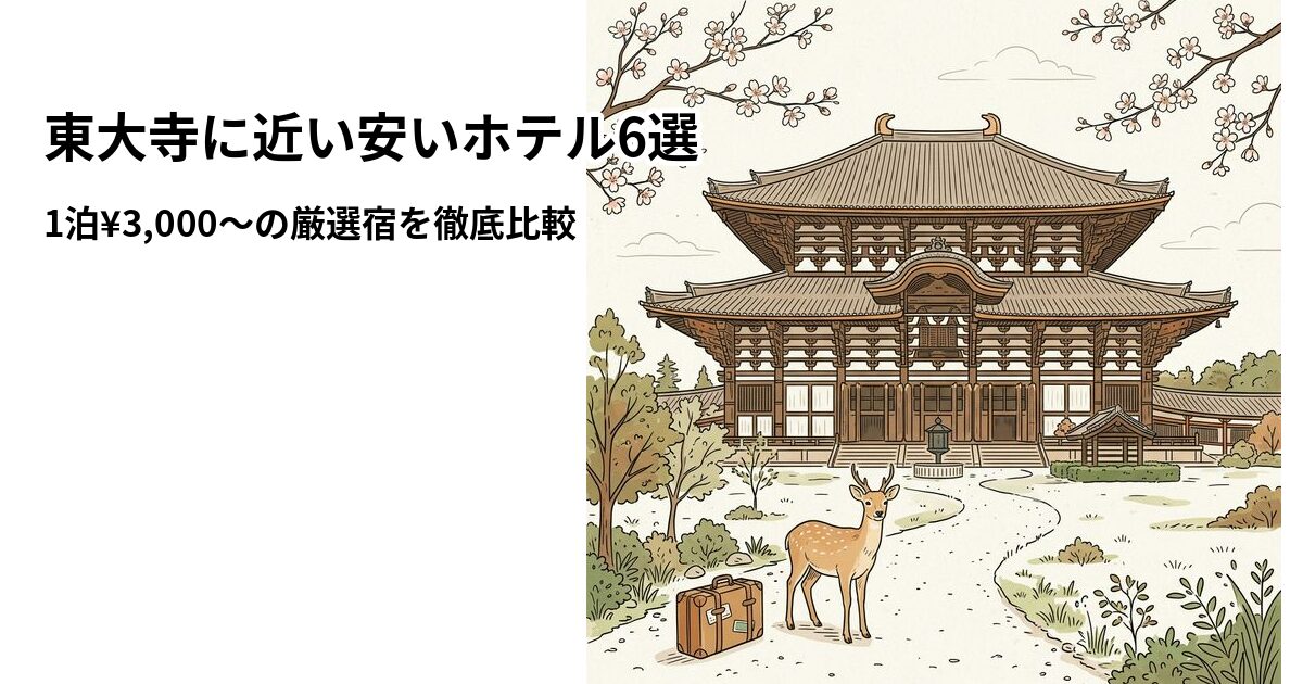 「東大寺に近くて安いホテルに泊まりたい」と探している方へ。奈良のシンボル・東大寺は大仏殿や南大門で知られる世界遺産ですが、観光シーズンは周辺のホテルがすぐに埋まってしまいます。また奈良公園エリアは京都ほどホテルの数が多くないため、「近い+安い」を両立する宿を探すのは意外と大変です。この記事では、東大寺から3km圏内で1泊¥3,000〜泊まれるコスパの良いホテル・宿6選を、楽天トラベルの料金・口コミデータをもとに徹底比較しました。