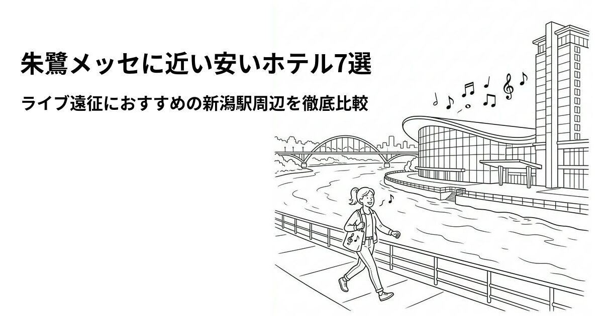 朱鷺メッセに近い安いホテルを7軒ご紹介しました。会場直結で終演後の移動ゼロという快適さならホテル日航新潟が文句なしの1位。コスパ重視ならジュラクステイ新潟(¥2,760〜)、温泉重視ならドーミーイン新潟、駅近重視ならホテルグローバルビュー新潟(駅徒歩1分)と、目的に合わせて選ぶのがおすすめです。